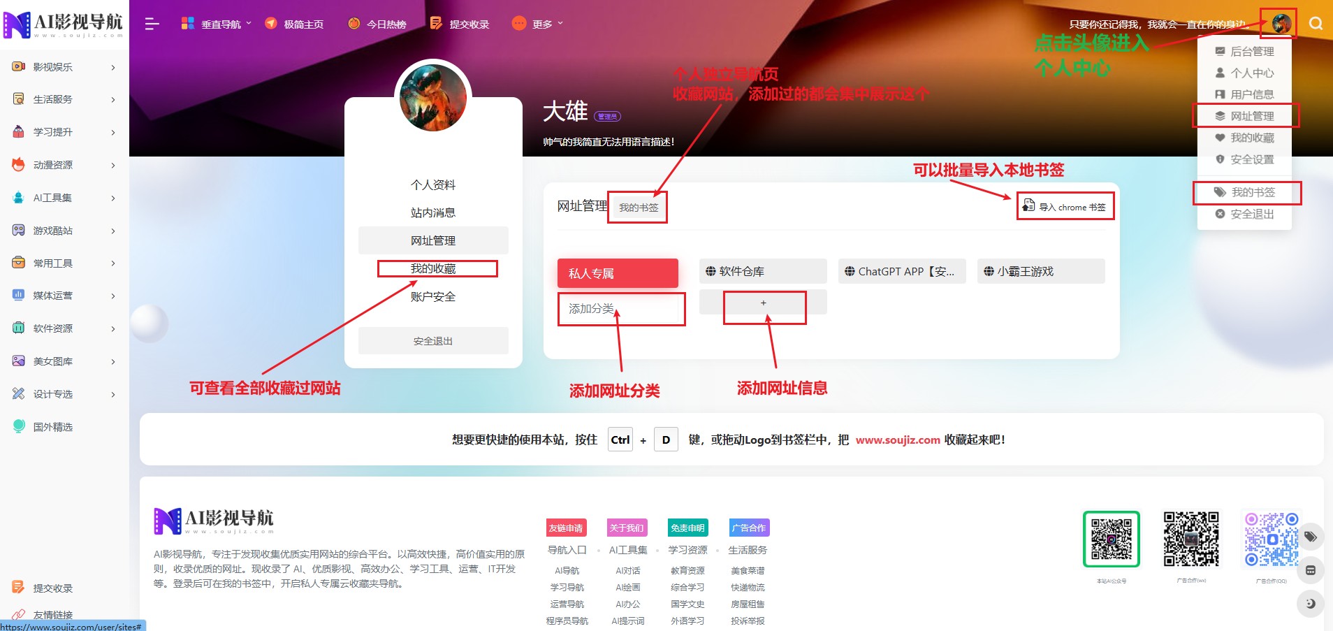 3.在本站AI影视导航右上角,用户中心 -> 网址管理页面,点击导入Chrome书签,将刚才导出的整个html文件导入即可。